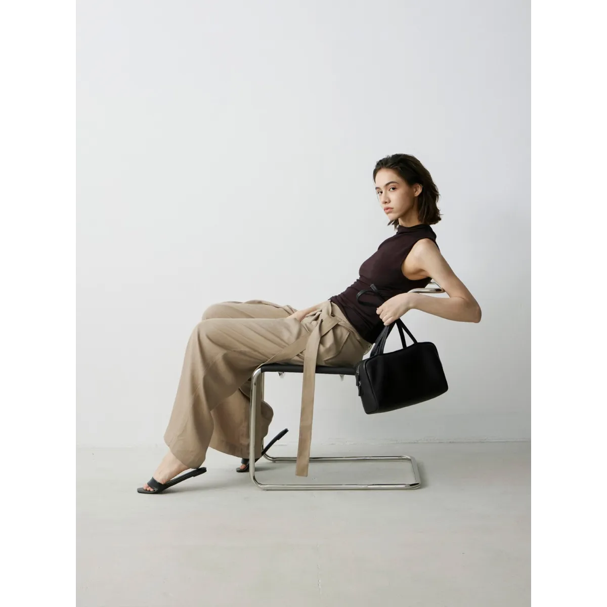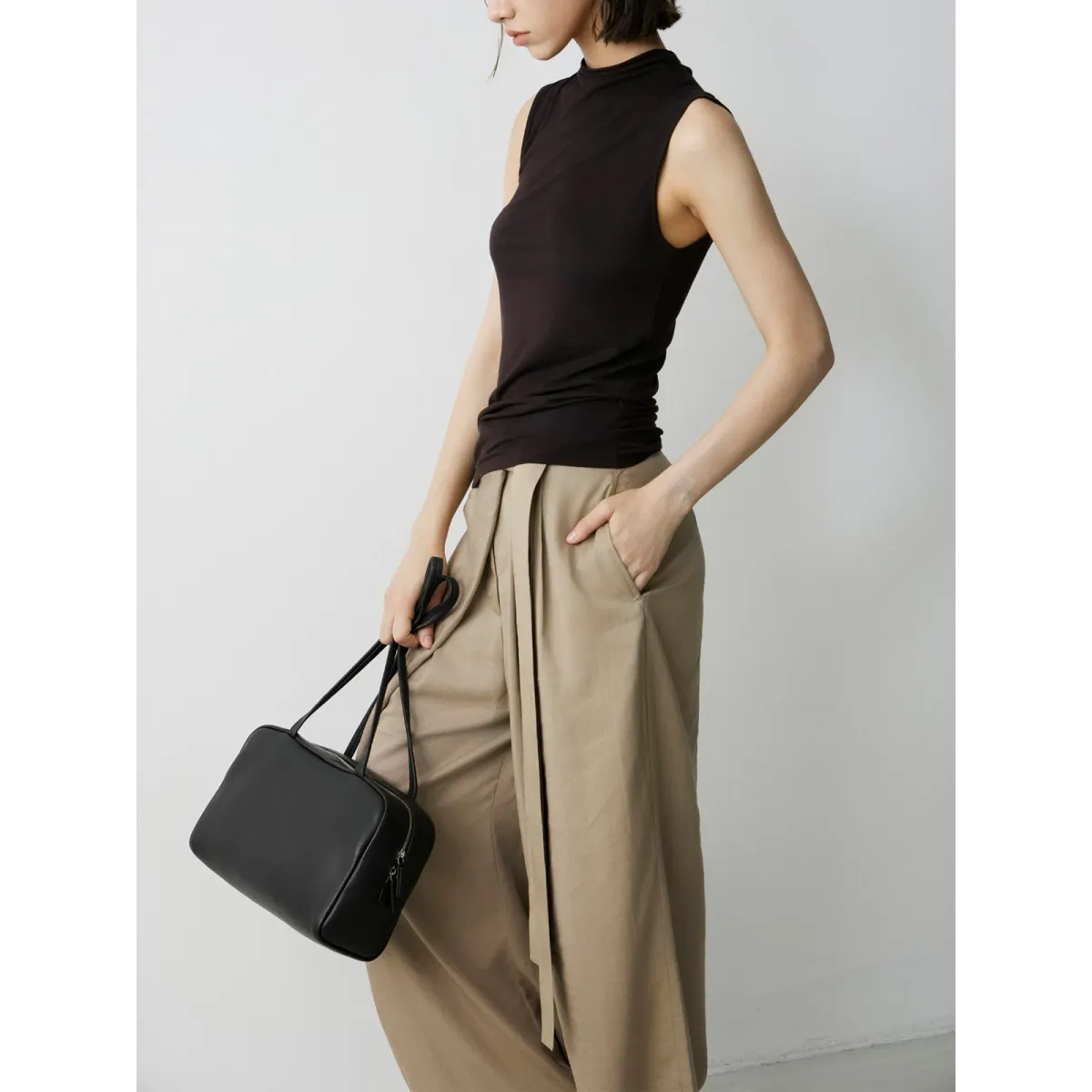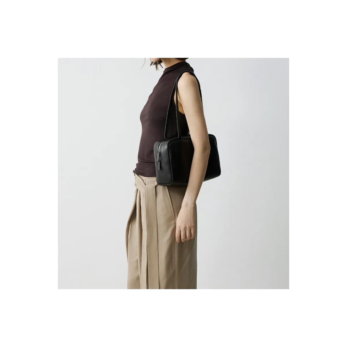 Designed with an unbranded, logo-free aesthetic, the bag is minimally finished to leave the natural grain surface intact.