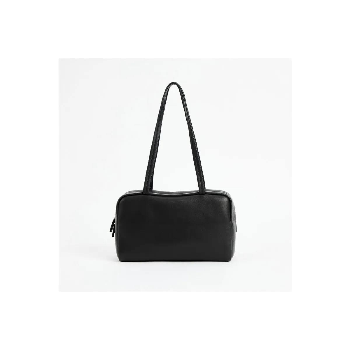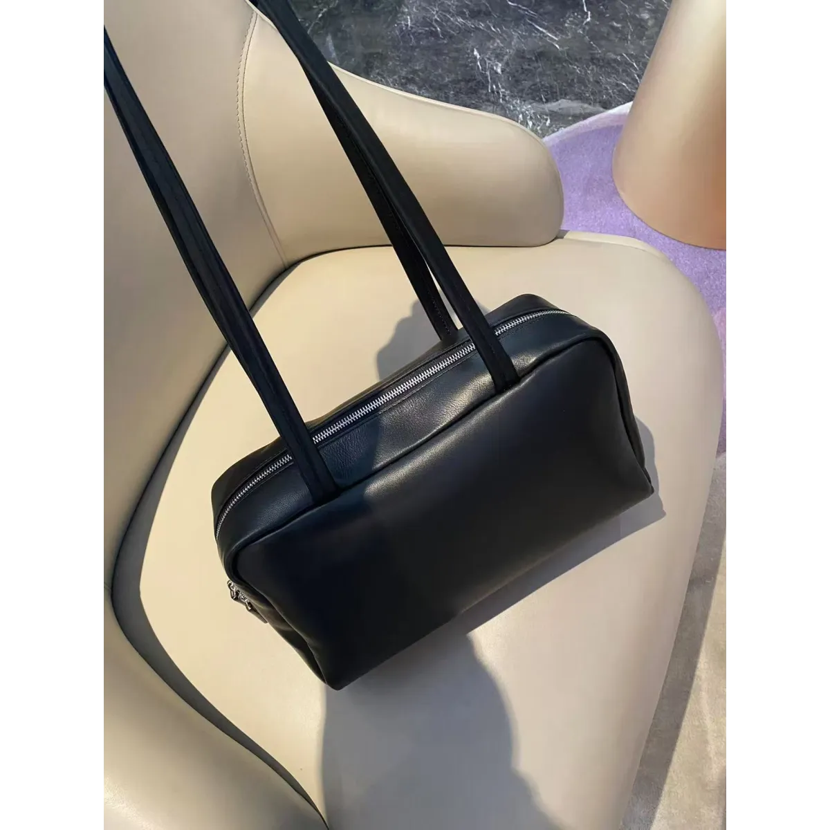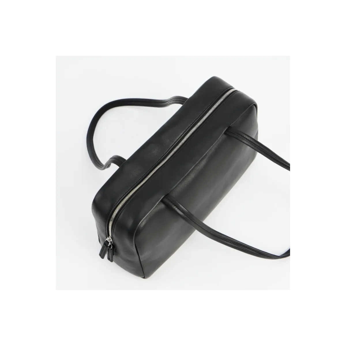 Handcrafted soft bowling bag in textured sheepskin leather with turned-edge construction, elongated flat handles, and zipper closure.