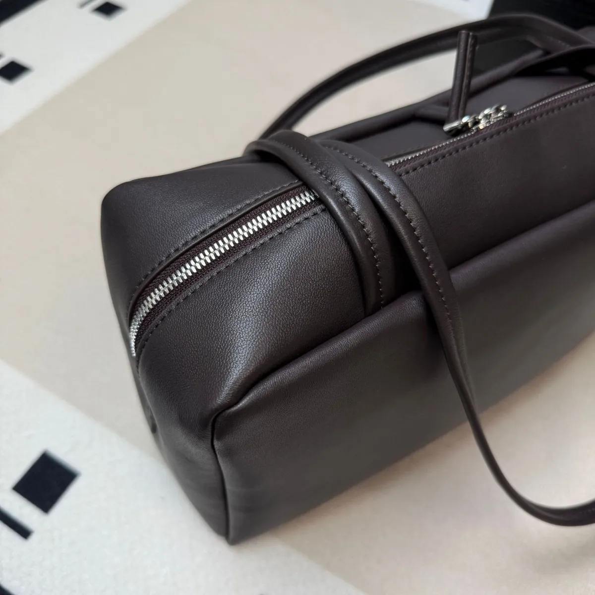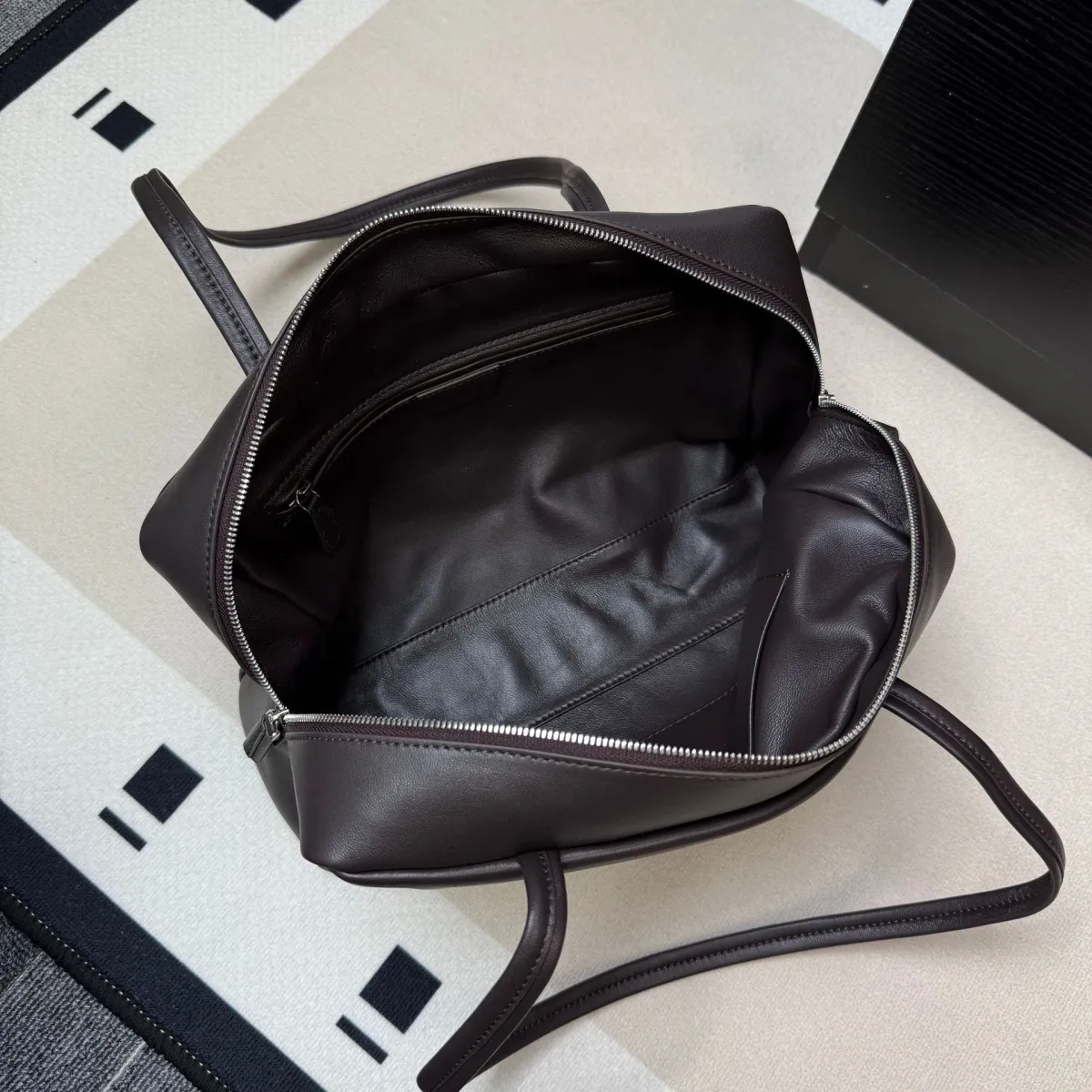 Отличное качество телячьей кожи. Она мягкая, но держит форму. Молния качественная, не дешевая. Даже без логотипа видно, что это дорогая вещь просто по текстуре.