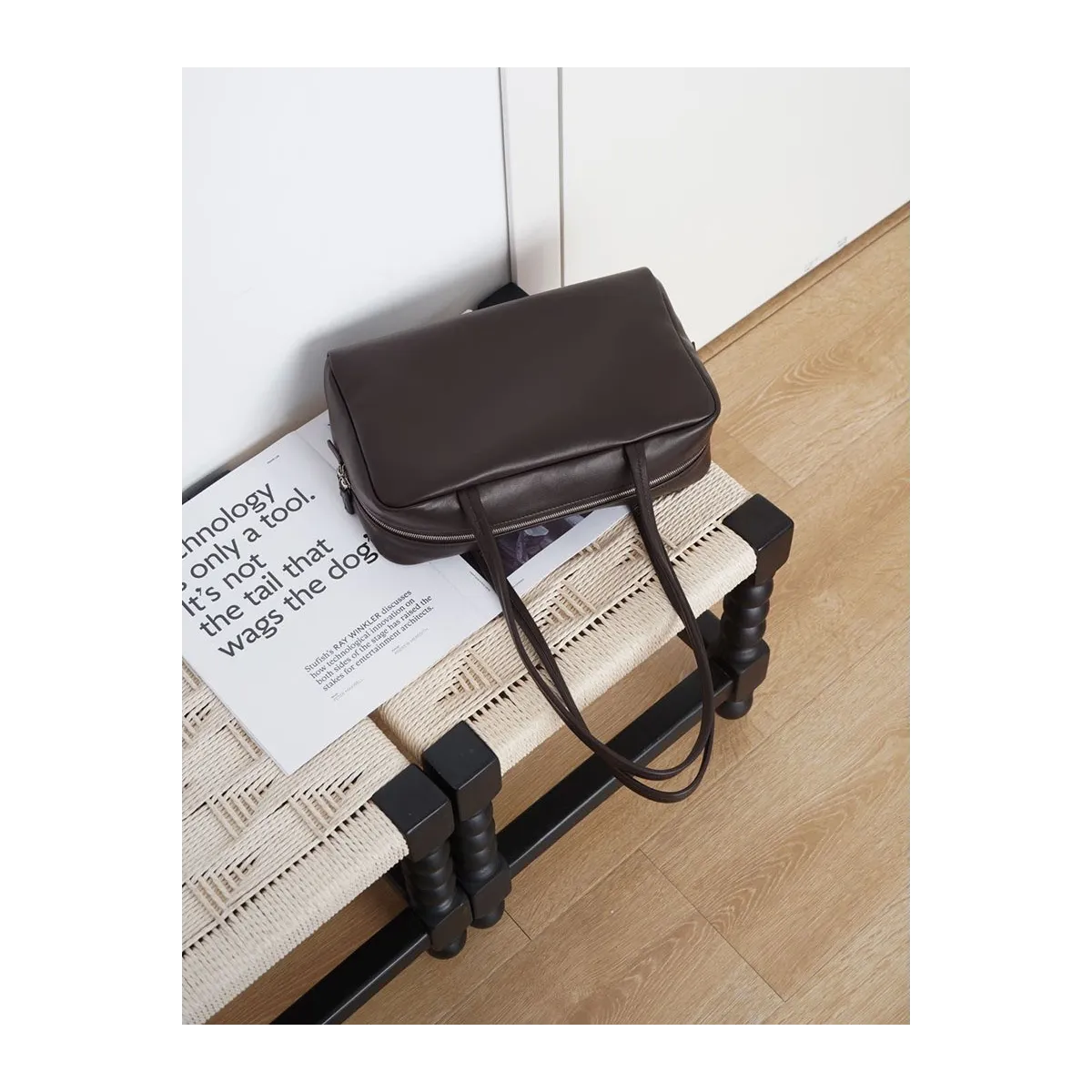 Designed with an unbranded, logo-free aesthetic, the bag is minimally finished to leave the natural grain surface intact.